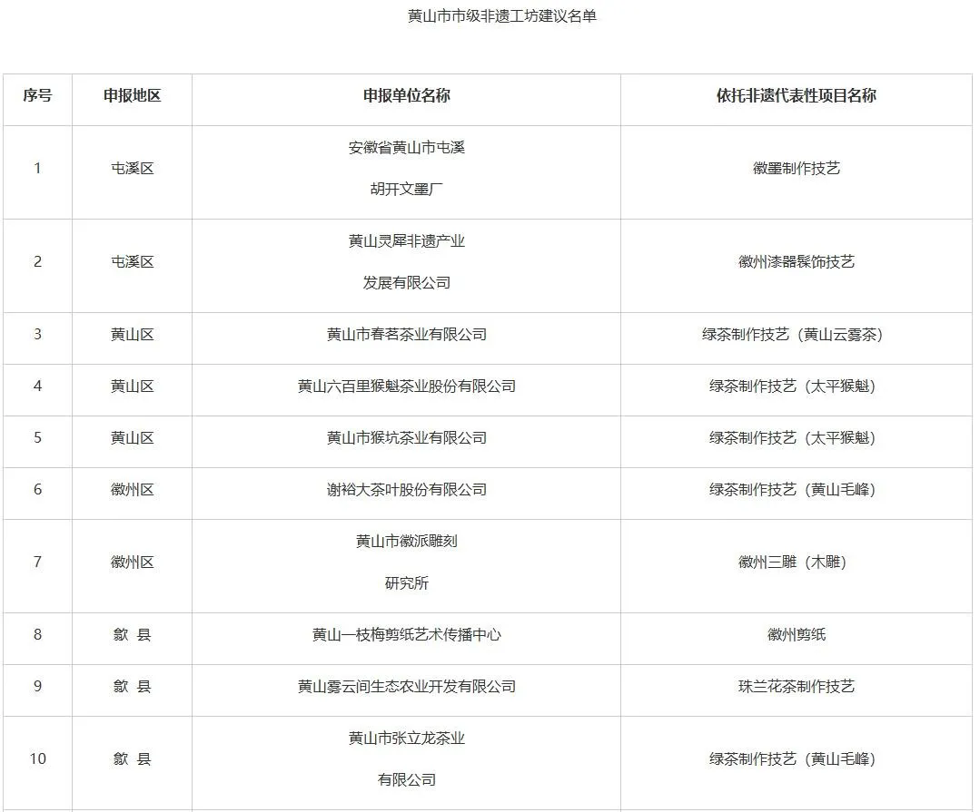 根據(jù)《安徽省文化和旅游廳安徽省人力資源和社會保障廳安徽省農(nóng)業(yè)農(nóng)村廳關(guān)于印發(fā)<安徽省非遺工坊管理辦法>的通知》要求,市文化和旅游局、市人力資源和社會保障局、市農(nóng)業(yè)農(nóng)村局聯(lián)合組織開展了市級非遺工坊認定工作。經(jīng)申報主體自愿申請、各區(qū)縣初審推薦、市級評審復核,形成市級非遺工坊建議名單,共19家,具體名單如下所示: